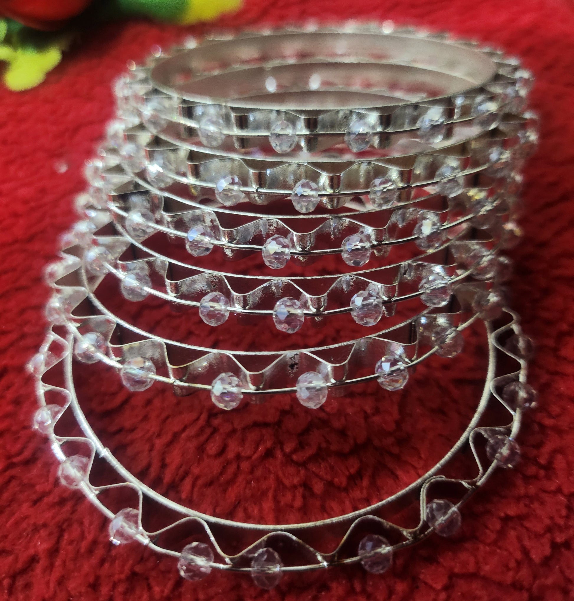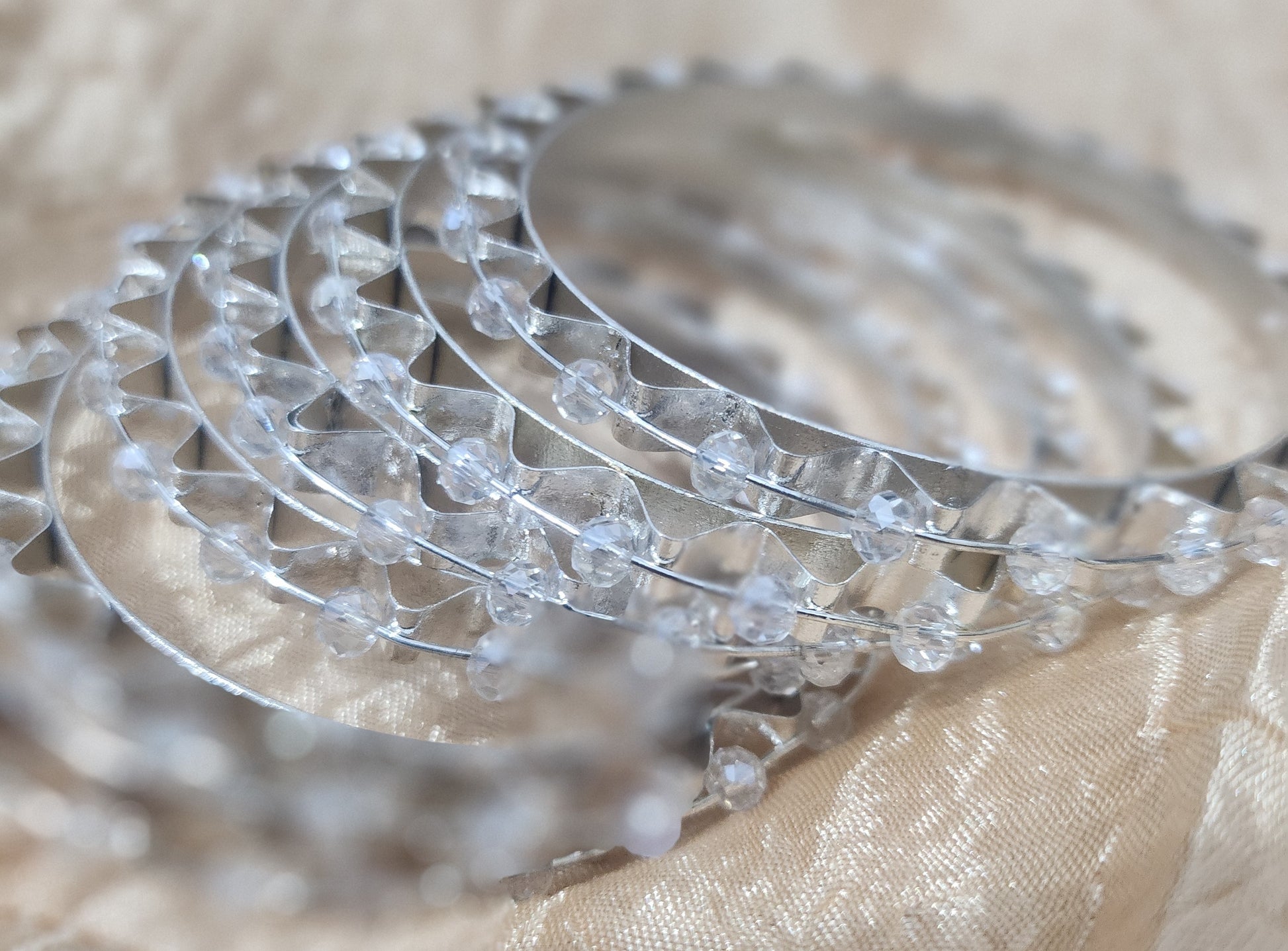 "Adorn your wrists with these exquisite silver-tone bangles, beautifully embellished with clear crystal beads. Each bangle shimmers with delicate craftsmanship, perfect for adding a touch of sparkle to any outfit, from everyday chic to special occasions. A perfect gift or a lovely treat for yourself!"
